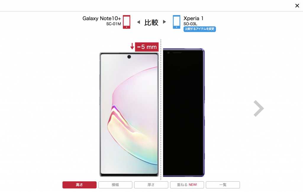 購入したい端末と比較アイテムを並べて、「高さ」の違いを視覚的に分かりやすく比較。