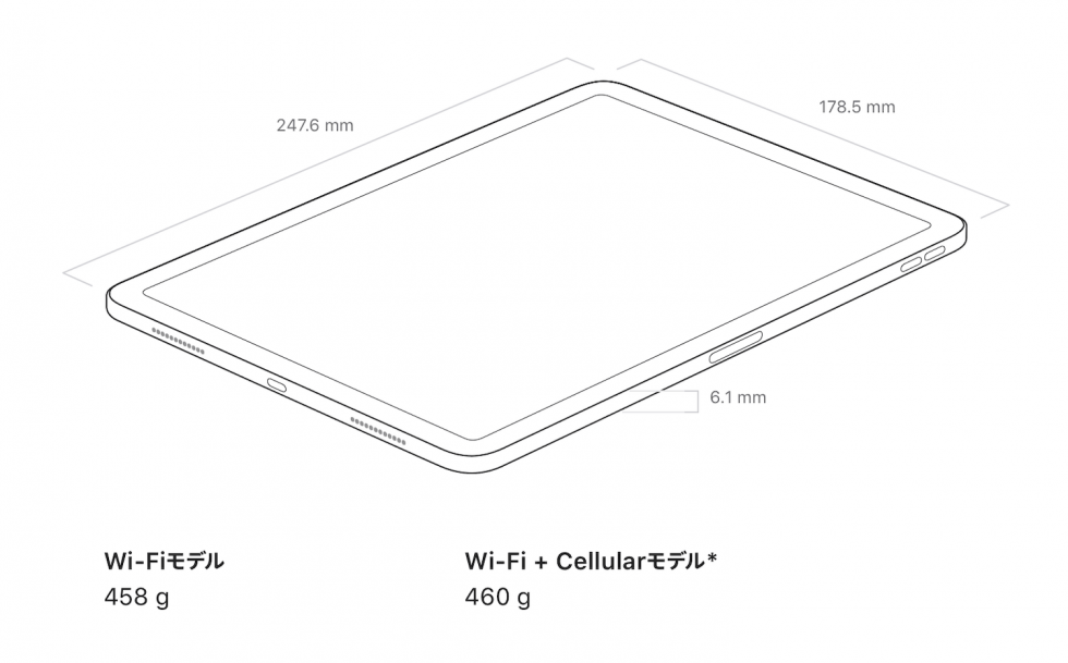 | 重さ | 458g(Wi-Fi) 460g(セルラー) |