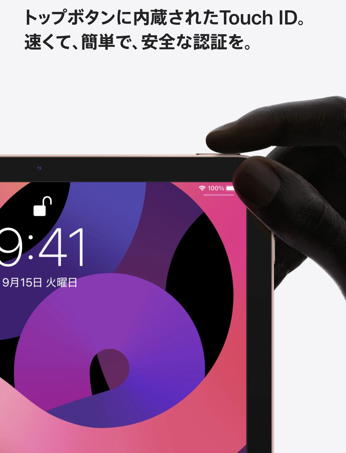 iPad Air(第4世代)は、トップボタン(電源ボタン)内蔵型のTouch IDを採用しています。