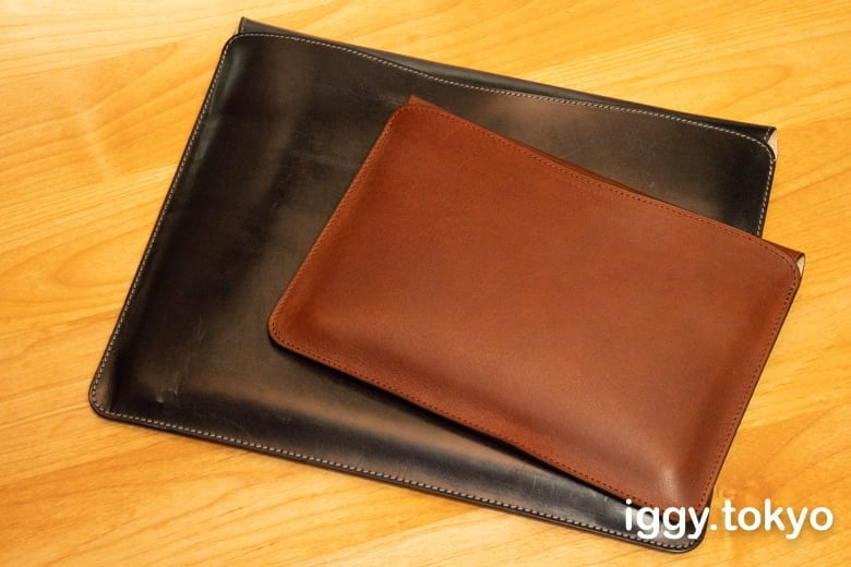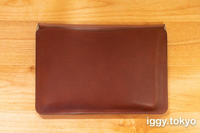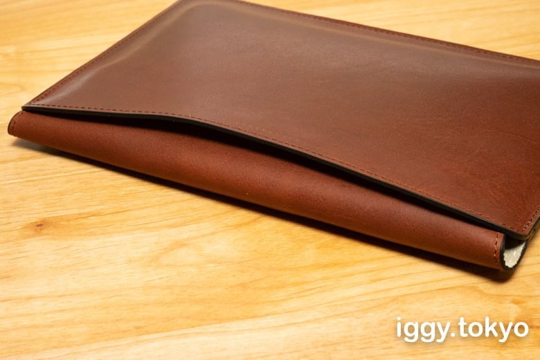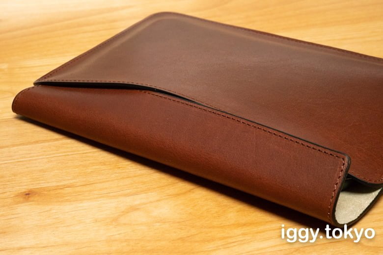 形としては、定番のレザースリーブにフラップ(蓋)が追加されたような形状です。