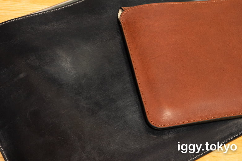 フラップカバーケース iPad Pro 12.9インチ(第3世代)用」のネイビーカラーが手元にあるので革質と色味を比較してみました。ネイビーカラーの皮は英国製ブライドルレザーになります。