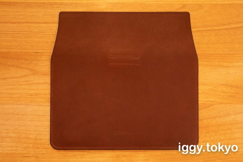 背面はiPad mini収納部分からフラップまで、つぎはぎなしの1枚革で形成されています。かなり贅沢に革を使っているのがポイント。