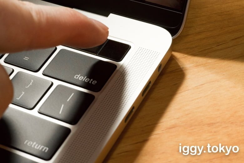 Touch Barの横にあるTouch ID(指紋認証)は超便利です。画面ロック解除やパスワード入力、決済までTouch IDでスムーズにできるのは素晴らしい。これは12インチMacBookにない魅力です。