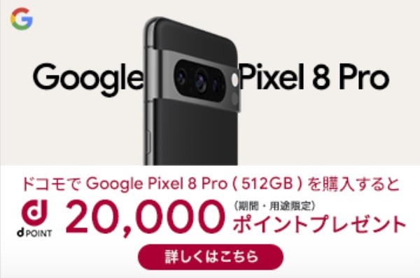Pixel8 Proの512GBモデルを購入するとdポイント(期間・用途限定)20,000ポイントがもらえるキャンペーンを実施中です。