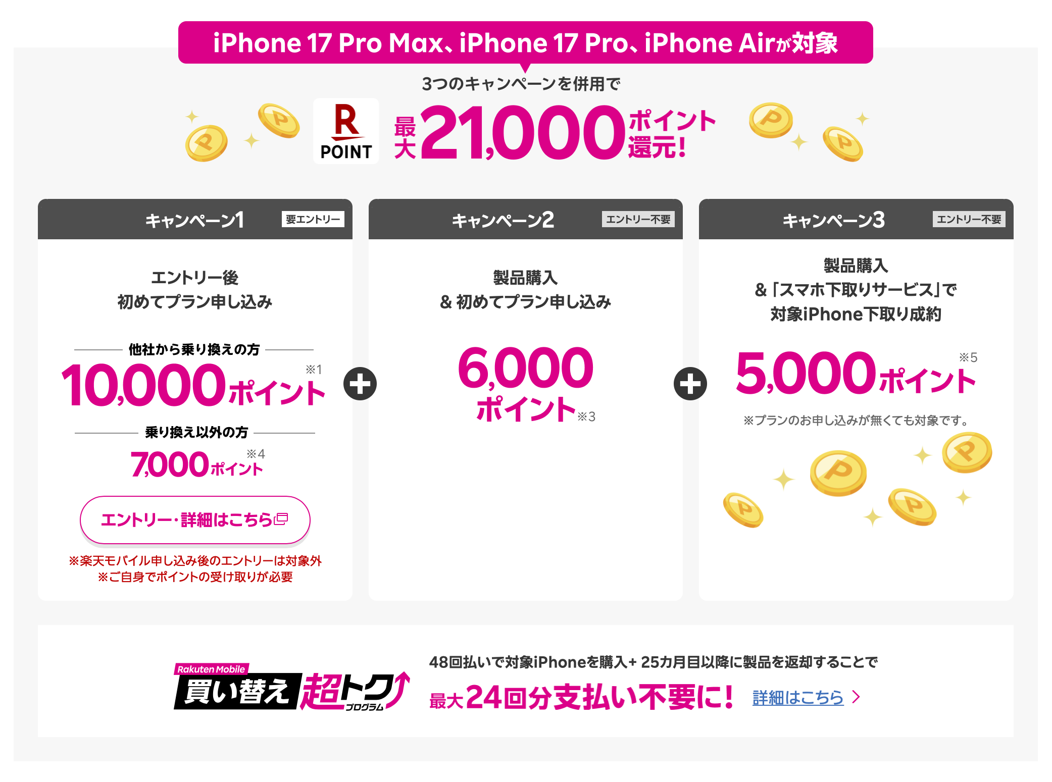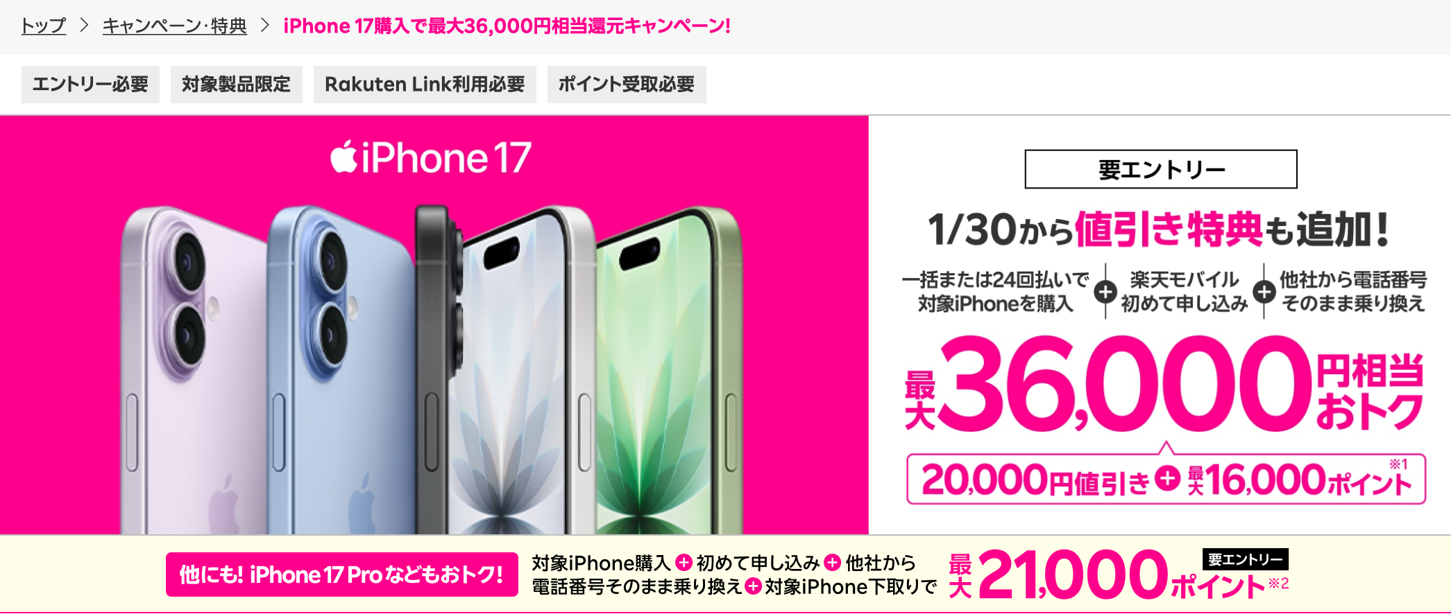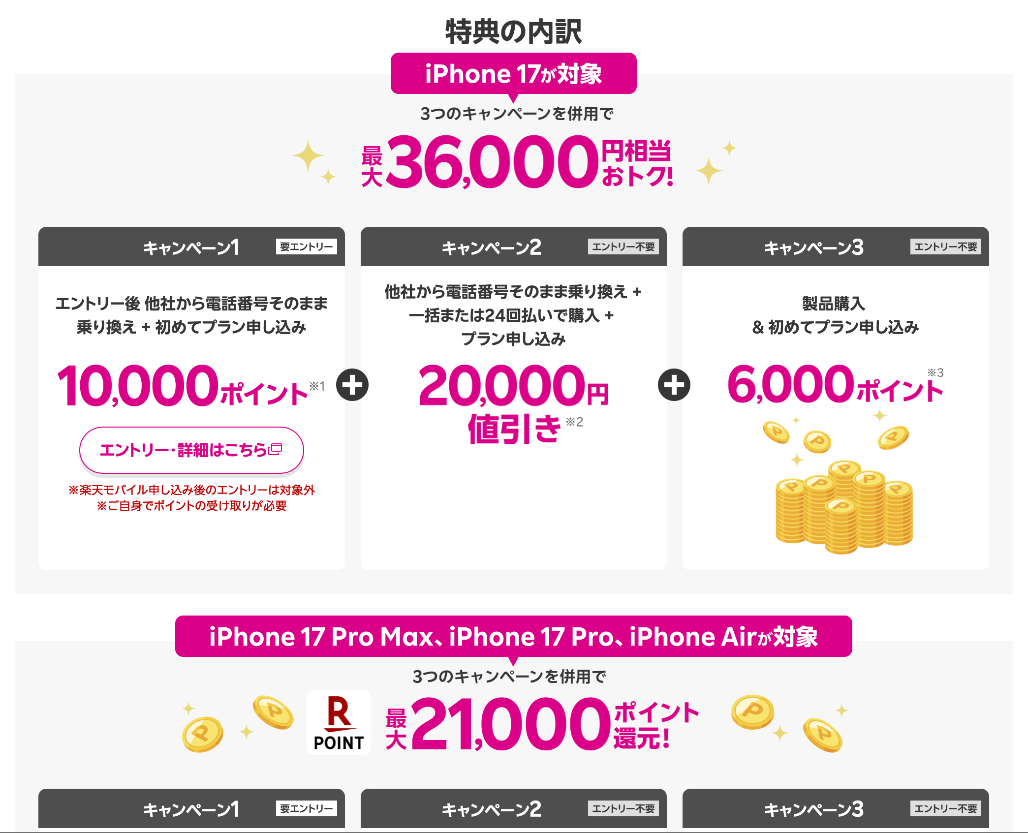 楽天モバイルのiPhone 17シリーズのキャンペーンは、モデルによって内容が異なります。ここが重要なポイントなので、しっかり確認しておきましょう。