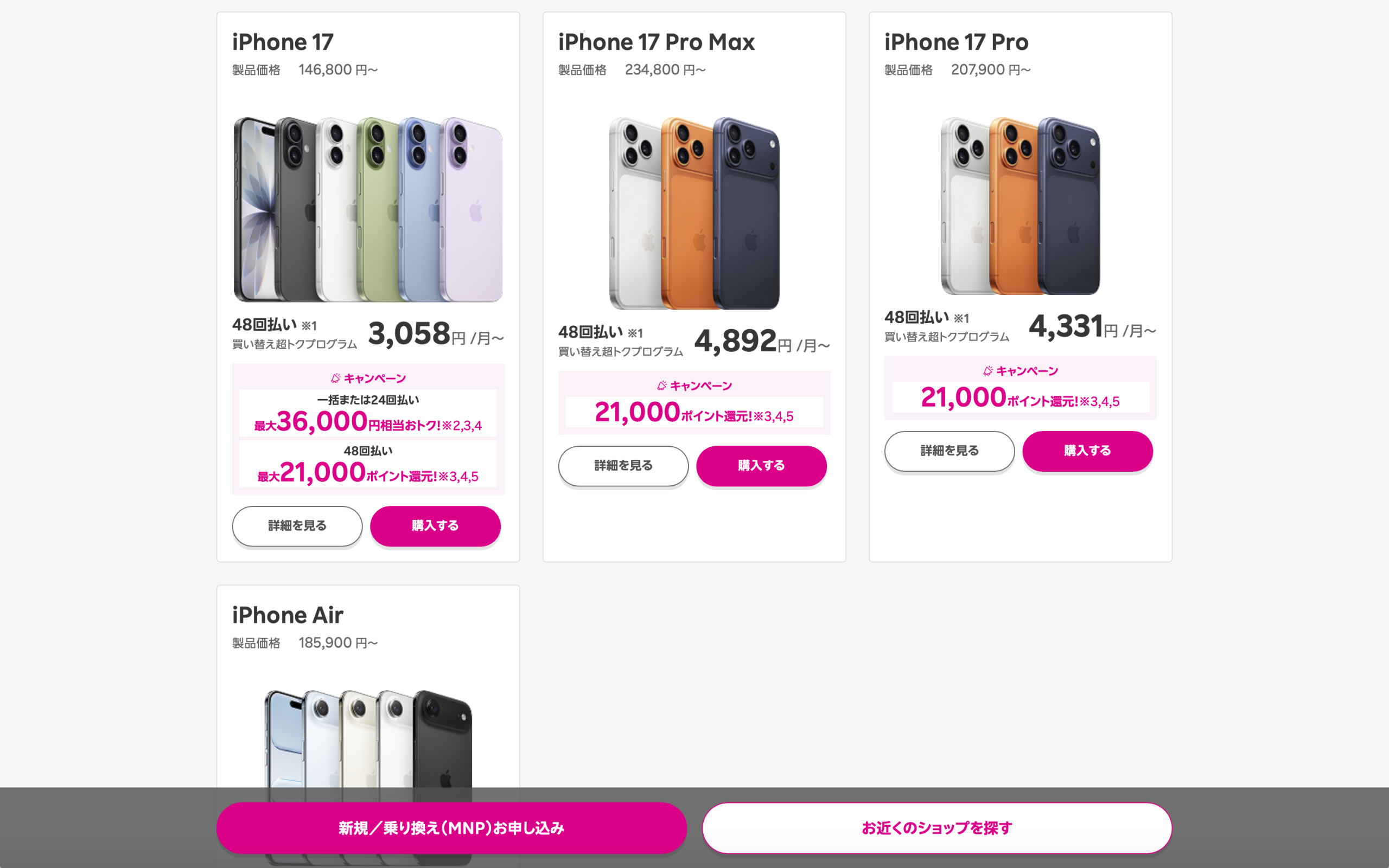 iPhone 17 Pro、iPhone 17 Pro Max、iPhone Airは最大21,000ポイント還元のキャンペーンが対象です。
