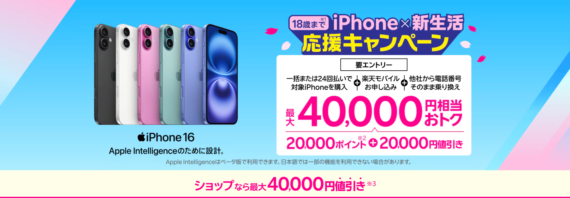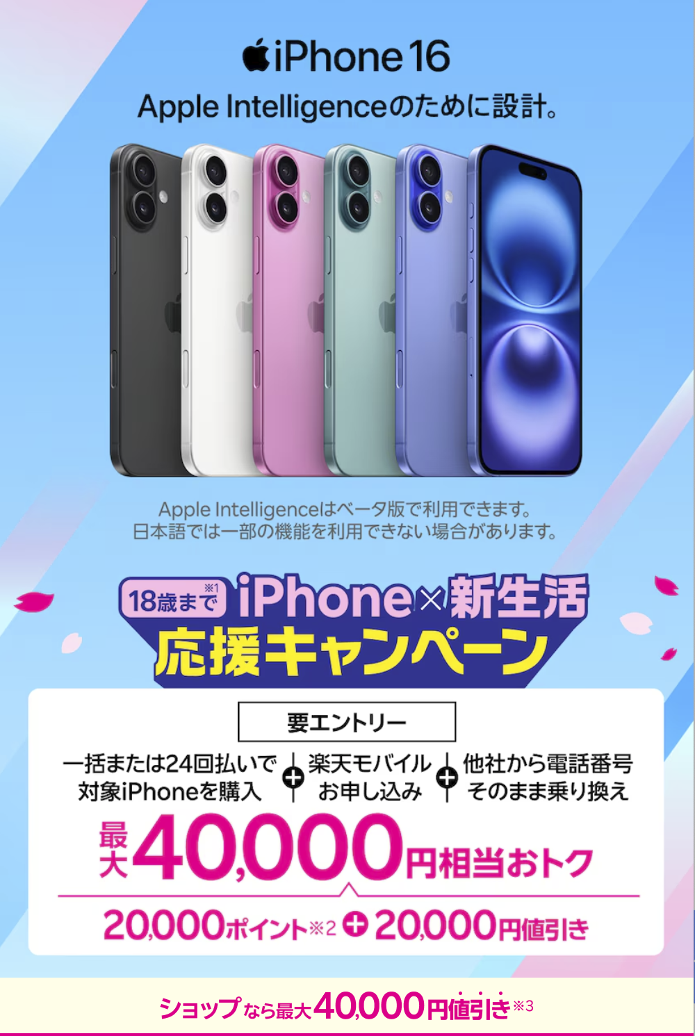 対象のiPhone 16(128GB)を購入し、楽天モバイルに申し込むことで最大40,000円相当の特典を受けることができます。