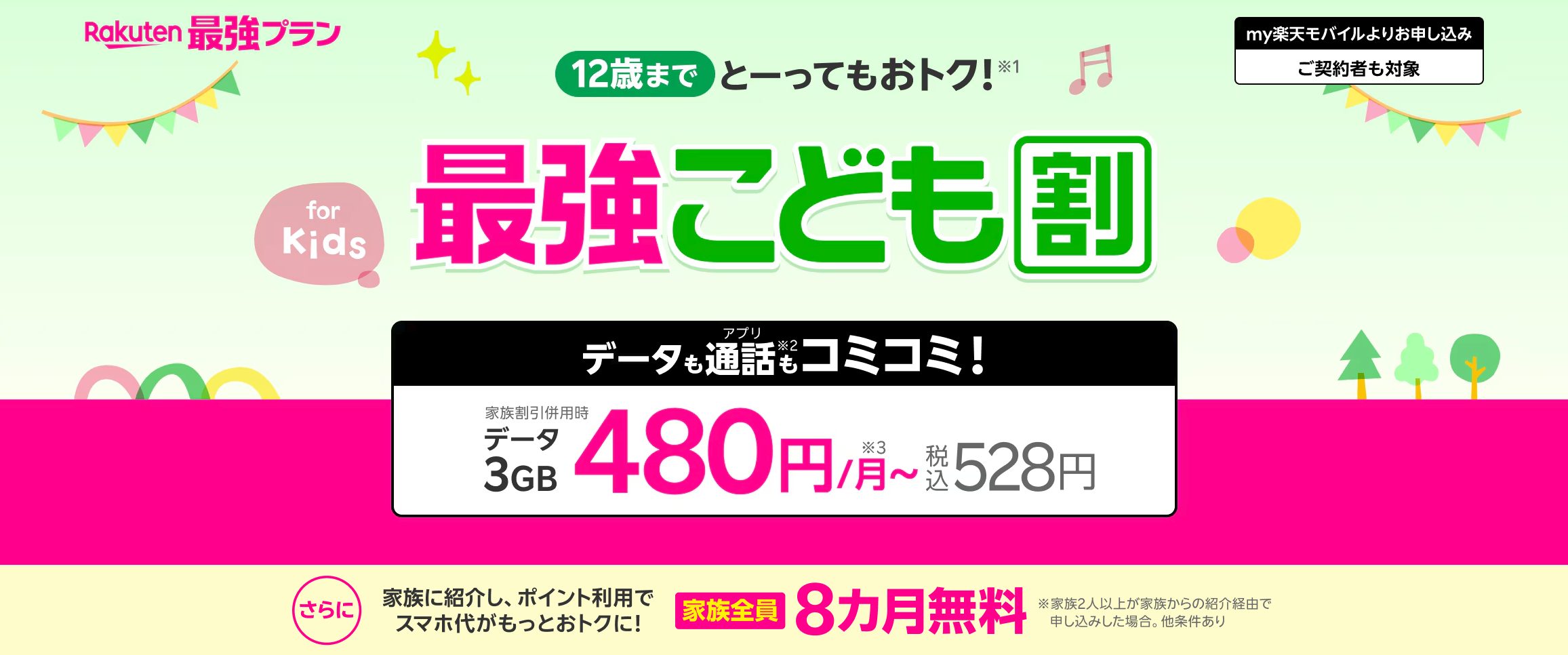 12歳以下のお子さんには「最強こども割」が適用されます。データ使用量が3GB以下なら毎月440円割引、3GBを超えた場合でも毎月110円割引されます。