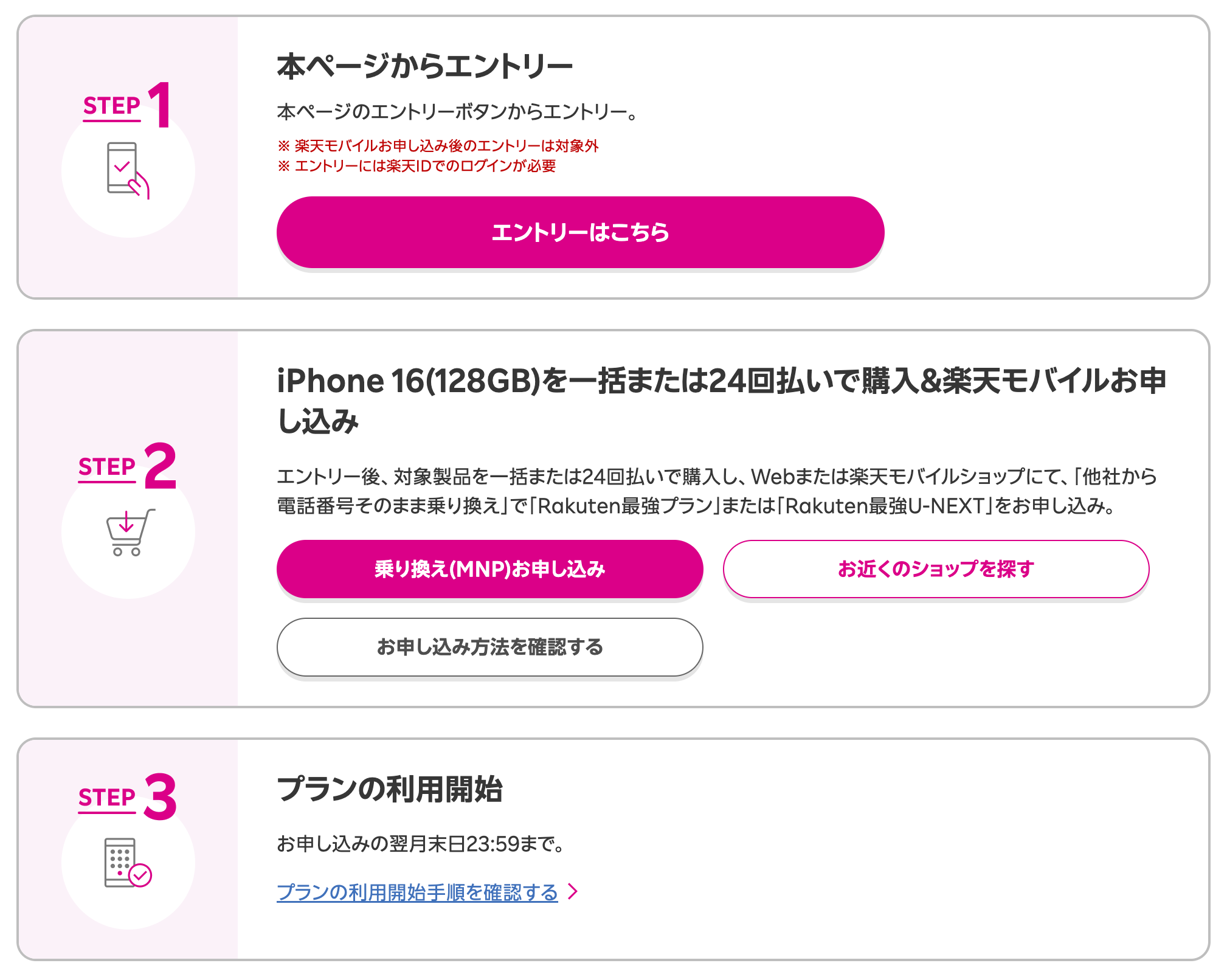 エントリー後、iPhone 16(128GB)を一括または24回払いで購入し、Rakuten最強プランまたはRakuten最強U-NEXTに申し込みます。他社からの乗り換え(MNP)なら、さらに20,000円値引きも適用されます。