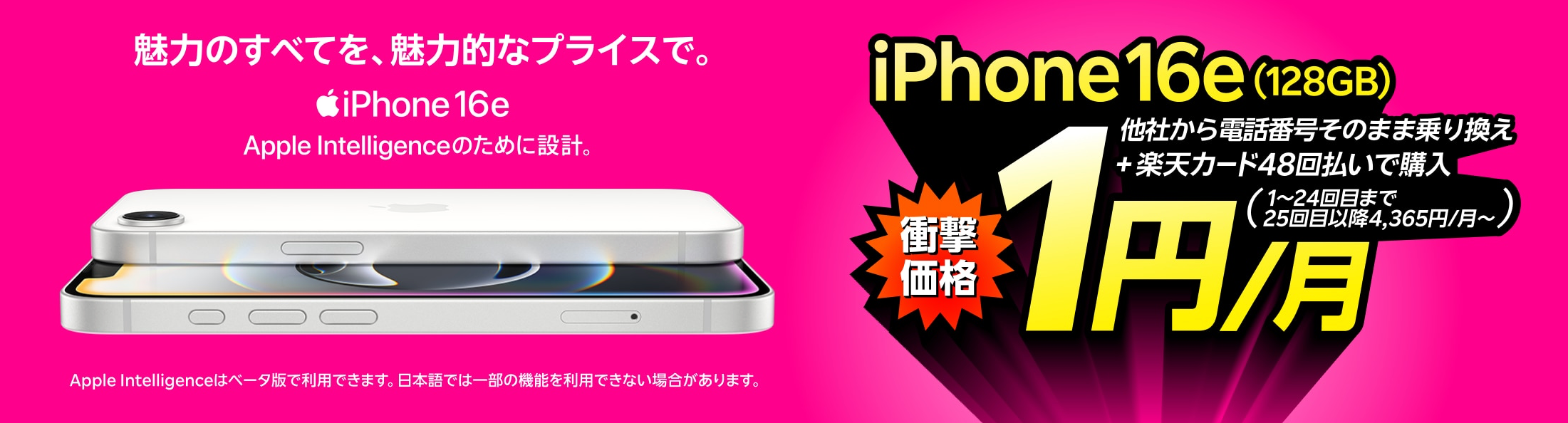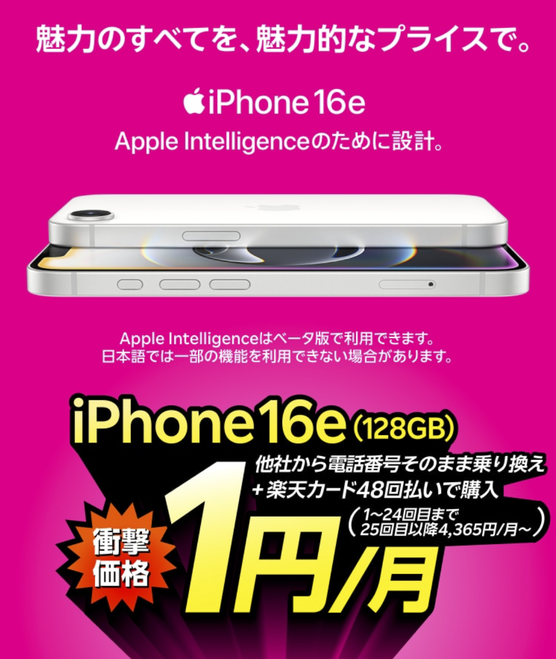楽天モバイルでiPhone 16eの128GBモデルが月々たったの1円で使えるキャンペーンが実施中です。