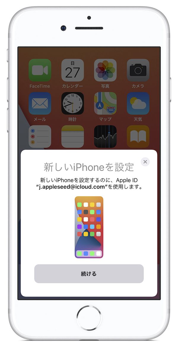 画面内の、「続ける」をタップすることで「クイックスタート」開始となります。(Bluetoothがオンになっているか確認を。)